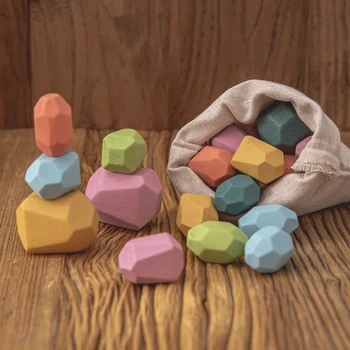 Houten stapelstenenOnregelmatige rotsstenen (in hout) met platte vlakken om zo hoog mogelijk een gebalanceerde toren mee te maken.